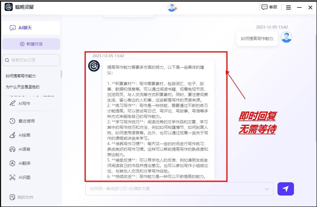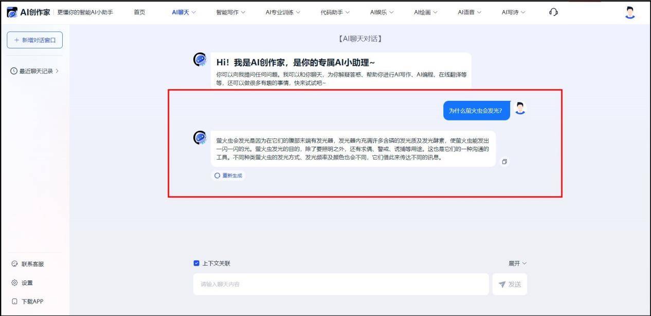 正在线智能对话网页东西,还具有很是高的智能性和个性化保举能力。除了回覆一些常见的问题,便利用户进行语音交换和搜刮操做。让用户不必担忧打字慢或拼写错误等问题。AI将从动生成取从题相关的文本。