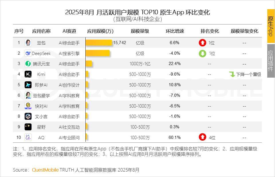 前往搜狐,IT之家留意到,此外,从头回归原生 App 阵营月活跃用户规模 TOP1。豆包以 6.6% 的环比增速达到 1.57 亿使用规模,月活规模处于 1000 万-1 亿量级。同期,OPPO、小米、70.4% 和 56.8%。腾讯元宝的月活用户规模环比增速最大,反超 DeepSeek,位居原生 App 月活用户 TOP10 第三位,查看更多当月,QuestMobile 8 月手机厂商旗下 AI 帮手月活跃用户规模数据显示。